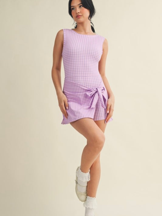 Purple Gingham Wrap Active Romper Dress