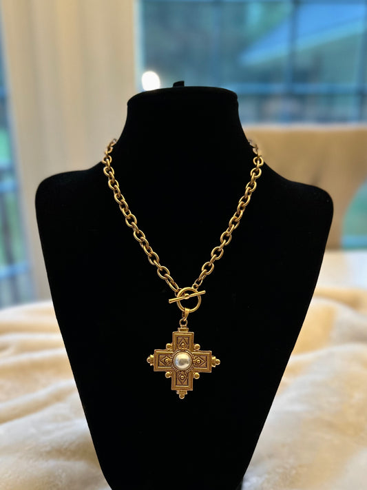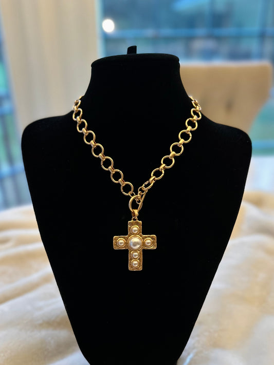 Cross & Pearl Cross Charm Matte Gold Necklace