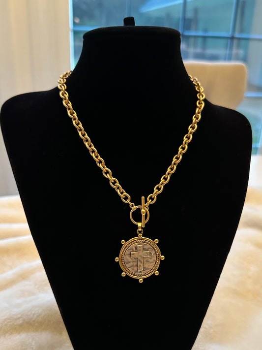 Stamped Cross Coin Matte Gold & Silver Necklace