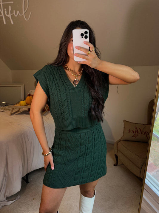 Dark Green Cable Knit Vest & Skirt Set