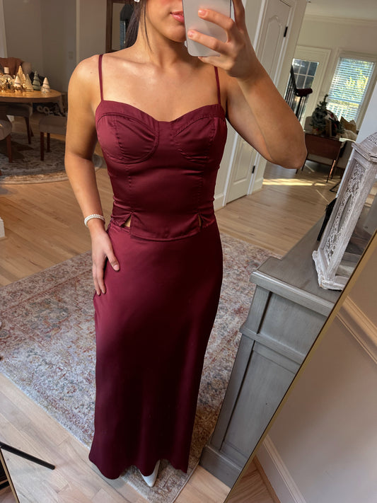 Burgundy Satin Top & Skirt Set