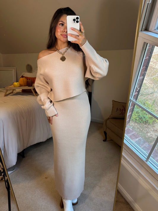 Sold outLight Taupe Sweater & Skirt Set
