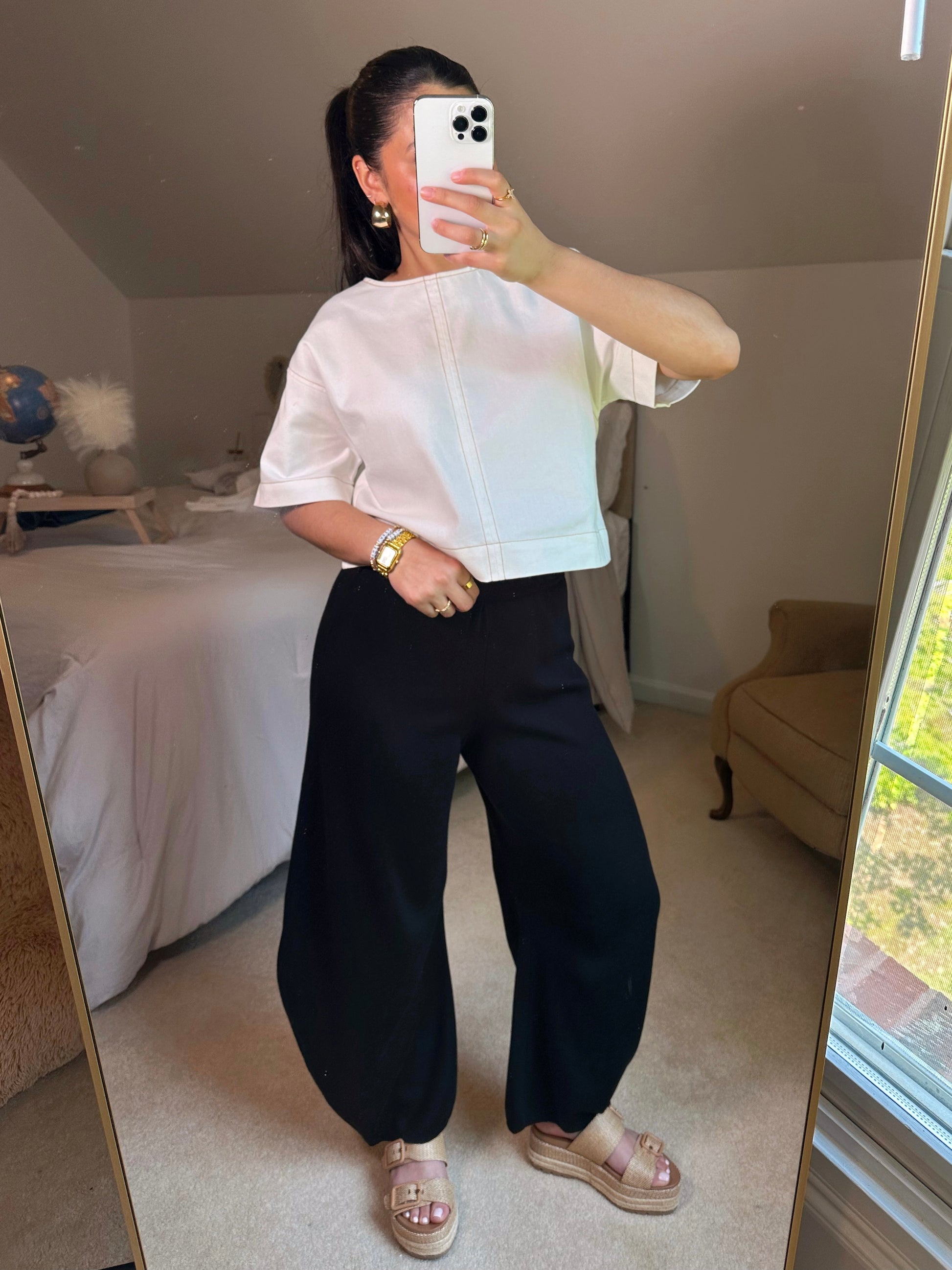 -model wearing size small. true to size. high quality pants. knit material. soft, cool, and breathable. super stretchy throughout and stretchy waistband. barrel baggy style.