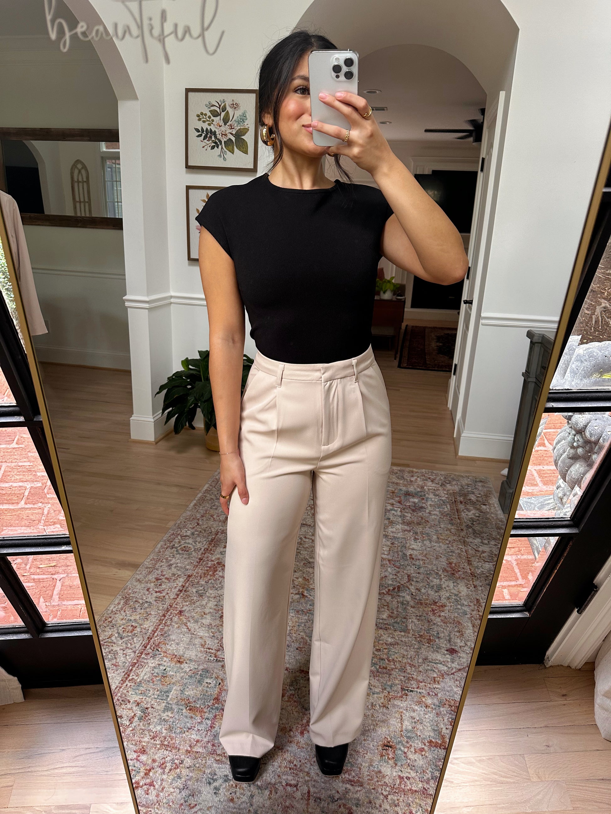 -ribbed, high neck, cap sleeve, mid-length top perfect for high wasted pants, amazing quality, double layered, must-have quality staple piece for your closet, black color.