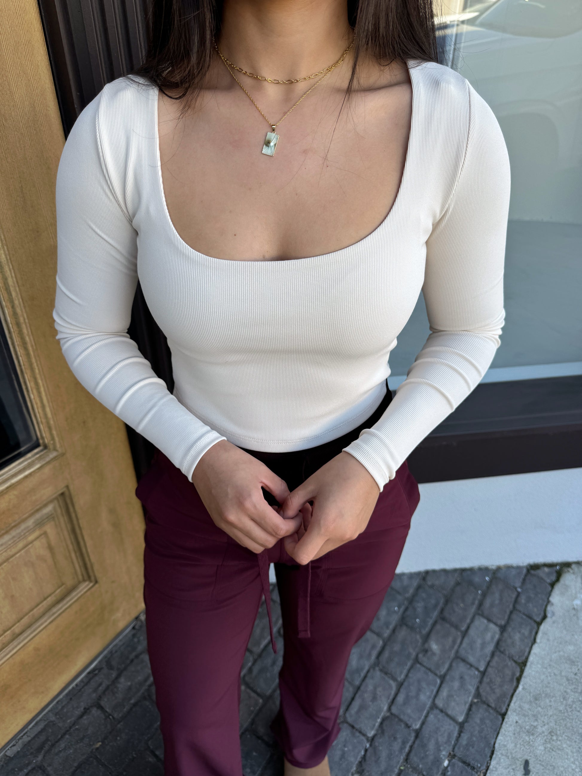 -ribbed fitted long sleeve top, amazing quality, cropped length, scoop neckline, covered back, double layered.