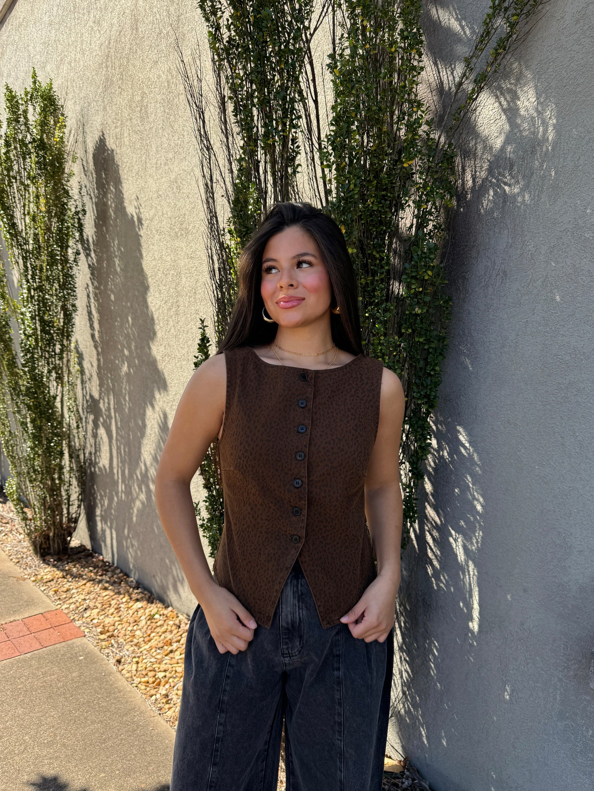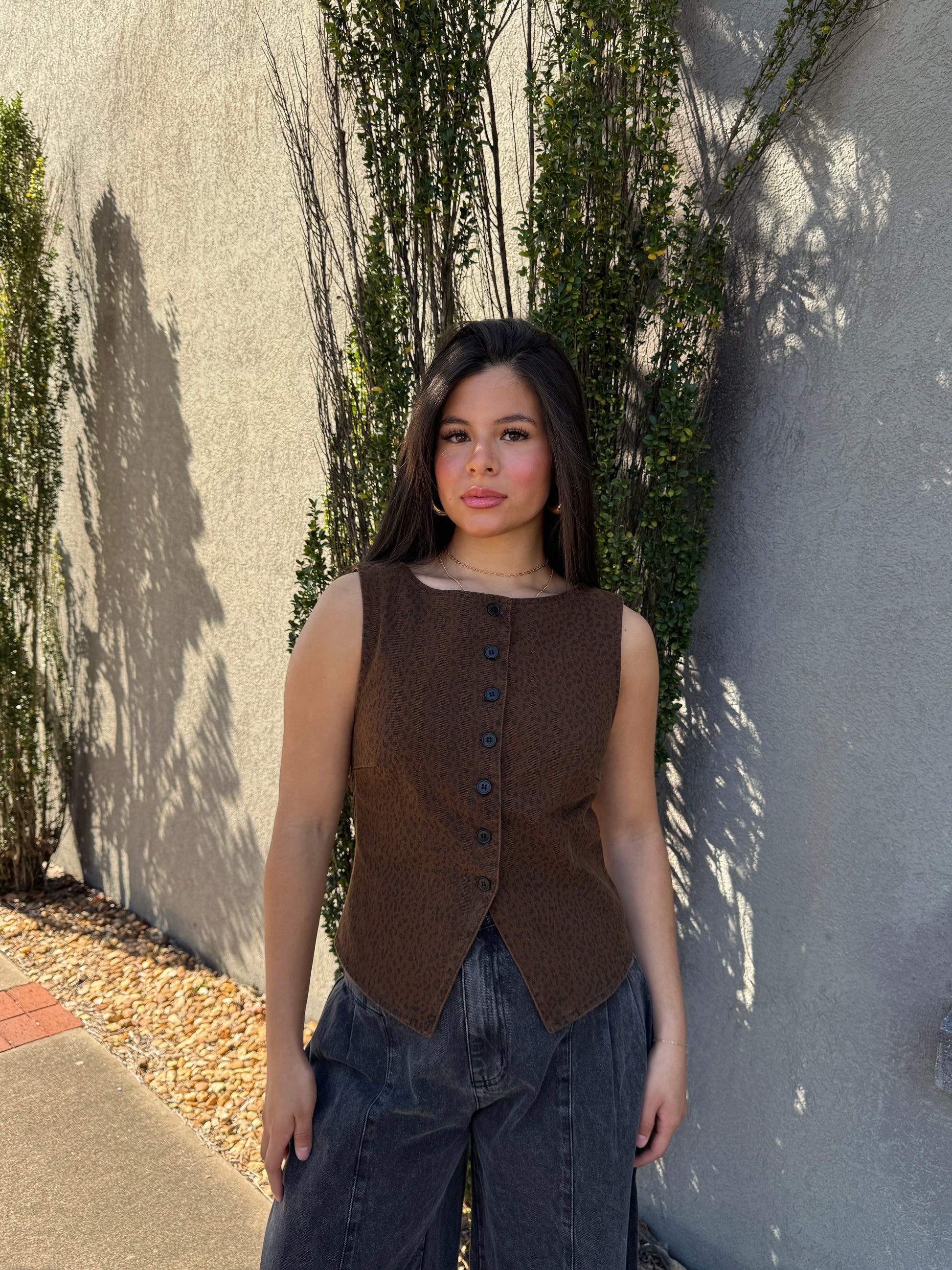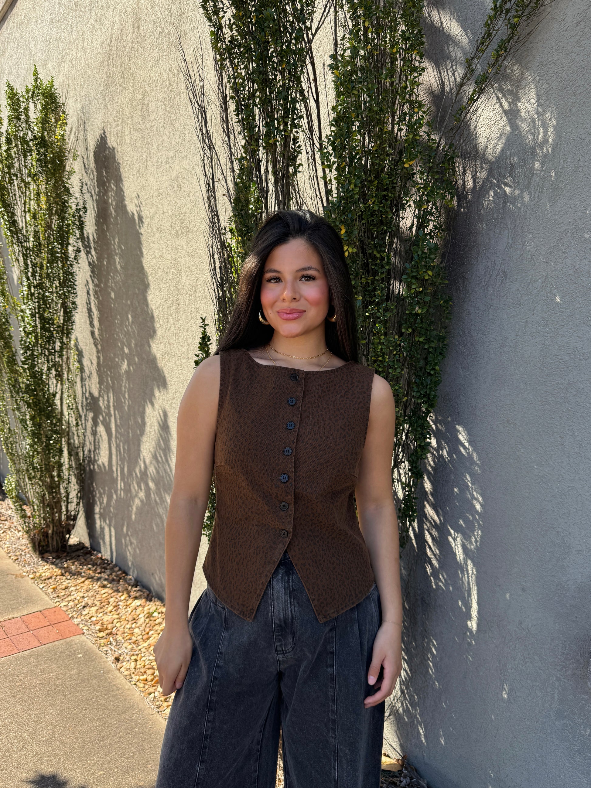 -cheetah print vest, functional buttons, boat neck, denim material, fitted but slight stretch, comfortable fit, so cute!