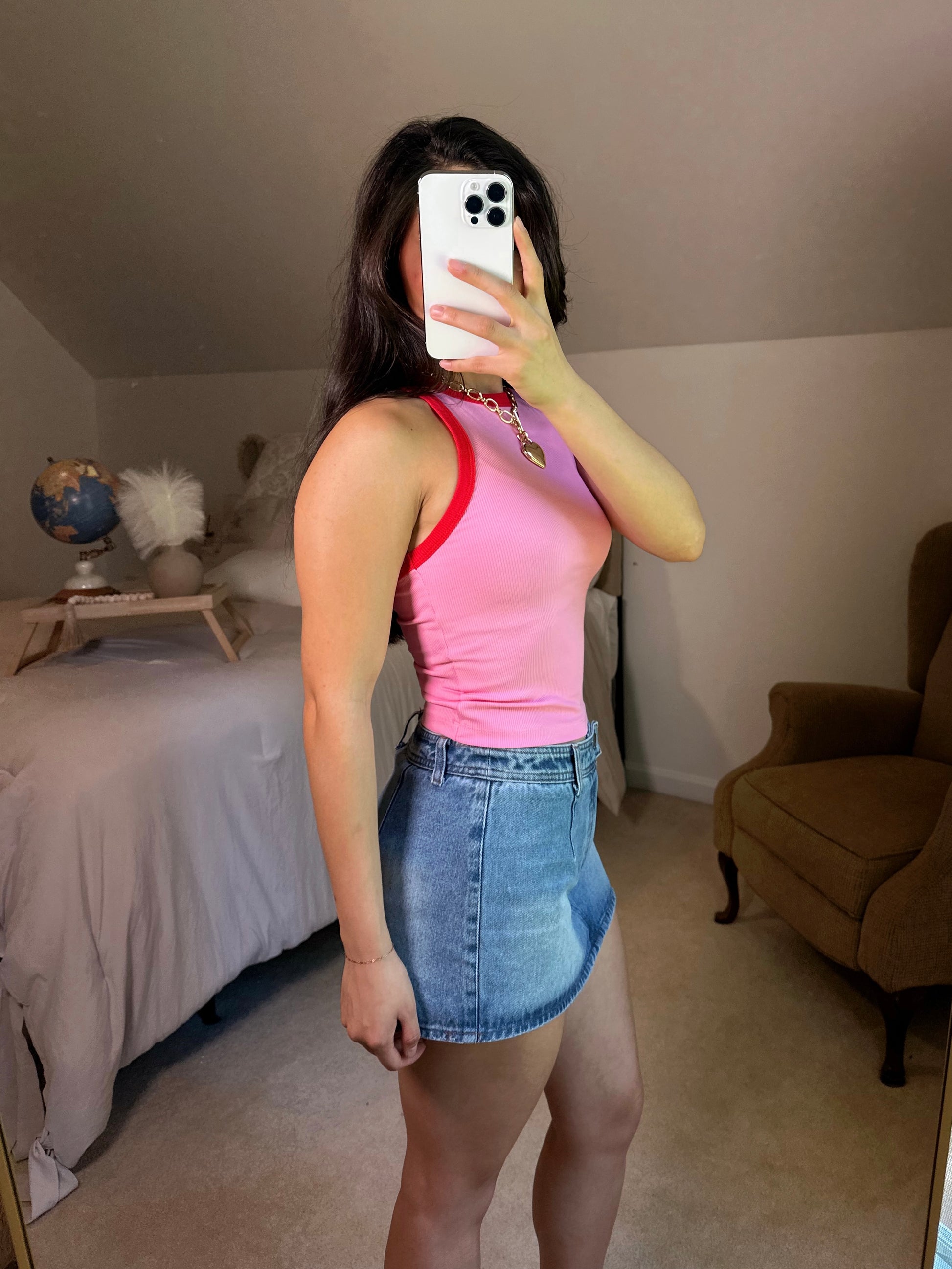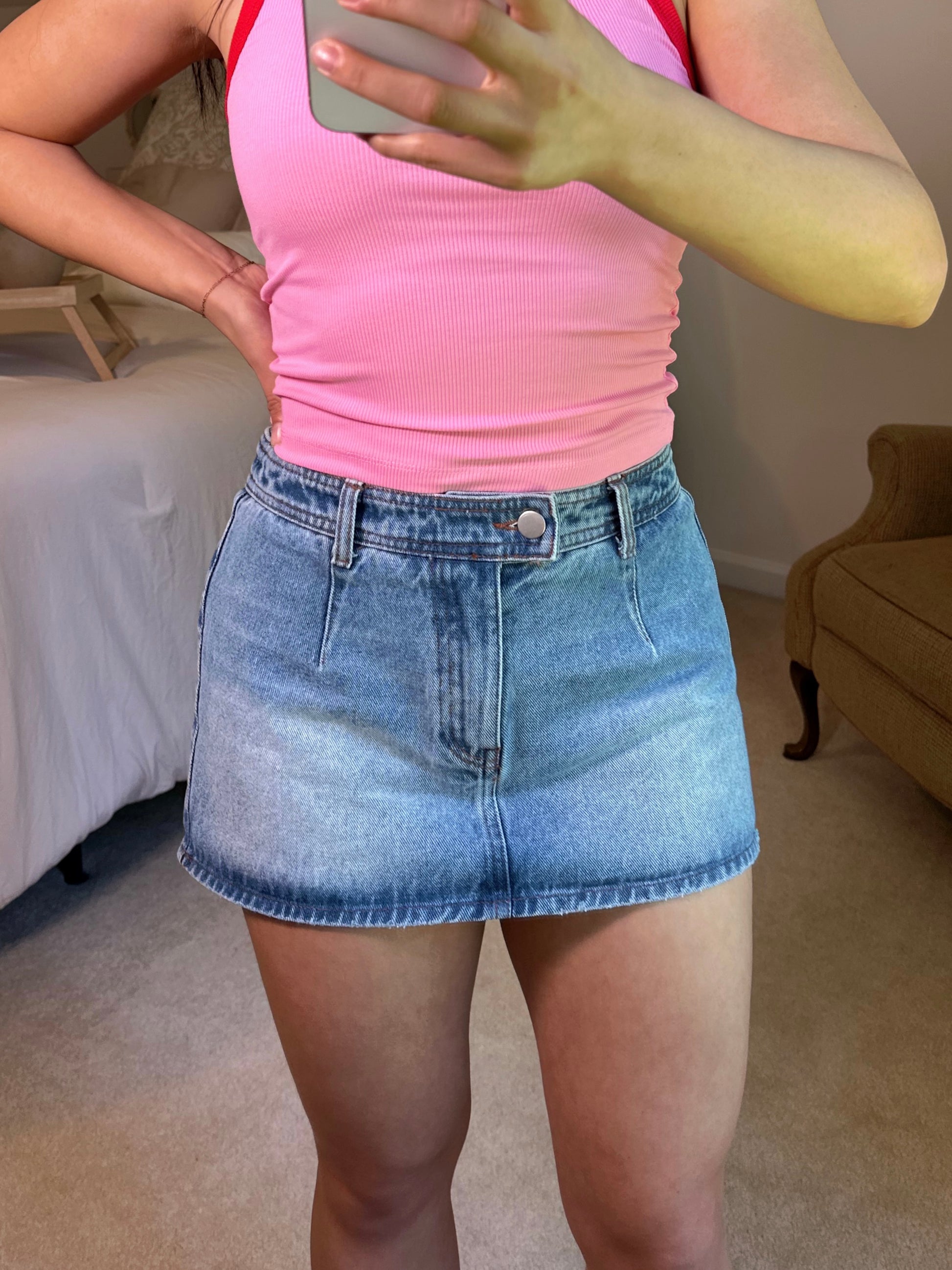 -built in shorts/ skort, denim, no stretch but fits just right and still comfortable, mid rise, button closure